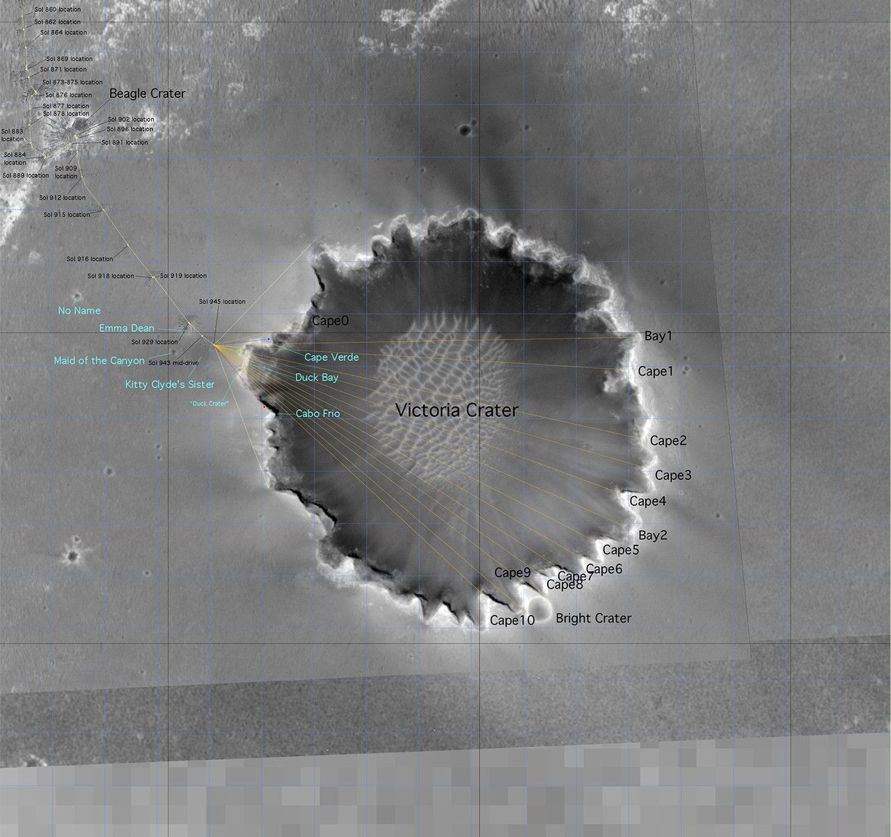 The yellow lines that surround and intersect Victoria Crater are used to measure the crater and the distance to the far "bays." North is up. Victoria Crater is about 800 meters (half a mile) in diameter.