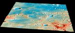 Colors: Coded by topography. The tallest regions are colored red and are roughly 3 kilometers (1.9 miles) higher than low-lying areas such as the floors of impact craters, colored blue.