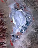 Prior to 1913, Owens Lake in eastern California had water up to a depth of 15 m, and covered an area of 280 km2. With the construction of the Los Angeles Aqueduct, all of the water from the Owens River was diverted to Los Angeles, and the lake dessicated, leading to dust storms that caused the worst air pollution in the state. Starting in 2002, various mitigation efforts were undertaken, including re-vegetation, flooding to create shallow ponds, and surface saturation to rehydrate the top layers. The Landsat image was acquired October 4, 1984 and the ASTER image on September 29, 2020. Both images cover an area of 25.6 by 32.3 km, and are located at 36.4 degrees north, 117.9 degrees west.