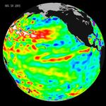 Looking at the entire Pacific basin, the Pacific Decadal Oscillation's warm horseshoe in the North and West Pacific and cool wedge pattern in the Eastern Tropical Pacific still dominates this sea-level height image. Most recent National Oceanic and Atmospheric Administration sea-surface temperature data also clearly illustrate the persistence of this basin-wide pattern.