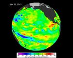 The latest image of sea surface heights in the Pacific Ocean from NASA's Jason-2 satellite, based on the average of 10 days of data centered on Jan. 26, 2013, shows that the equatorial Pacific Ocean is now in its 10th month of being locked in what some call a neutral, or "La Nada" state. "La Nadas" make long-range climate forecasting more difficult due to their greater unpredictability. Yellows and reds indicate areas where waters are relatively warmer and have expanded above normal sea level, while blues and purple areas show where waters are relatively colder and sea level is lower than normal. Green indicates near-normal sea level conditions.