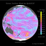 The intense surface winds of Typhoon Olga, represented by yellow spirals, can be seen moving around South Korea in the China Sea. QuikScat tracks its birth as a tropical depression in the Philippines and its northward journey in the western Pacific to its landfall in Korea. The eastern North Pacific is dominated by a persistent high-pressure system, whose anticyclonic (clockwise) flow creates strong winds blowing parallel to the coast of Canada and the United States. Three groups of very intense winter storm scan be seen around Antarctica, which are associated with the season of maximum sea ice in that region of the world.