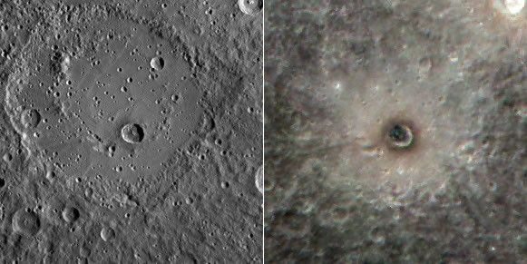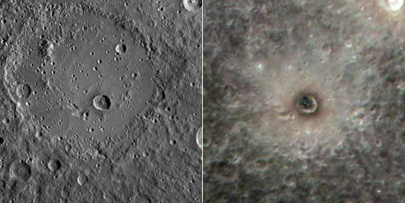 Today's offering shows two views of the crater Berkel. The image on the left is a monochrome image obtained when the Sun was lower on the horizon than when the color image on the right was collected. As a result, the left image emphasizes the topography of the surface (due to the presence of shadowing), whereas the image on the right is dominated by inherent differences in reflectance and color. The impact that formed Berkel excavated dark subsurface material and deposited it around the crater's rim. The presence of this low reflectance material causes the floor of the crater to appear black in the color image.