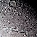 The prominent, complex fracture in the bottom of the frame extends over 85 kilometers (53 miles) in length across the field of view. From Cassini's oblique vantage point, the walls of the large fracture are clearly visible. A pervasive network of narrow, parallel grooves can be seen in many places in the image, and they appear to slice the surface into parallel slabs of ice approximately 500 meters (1,600 feet) in thickness.