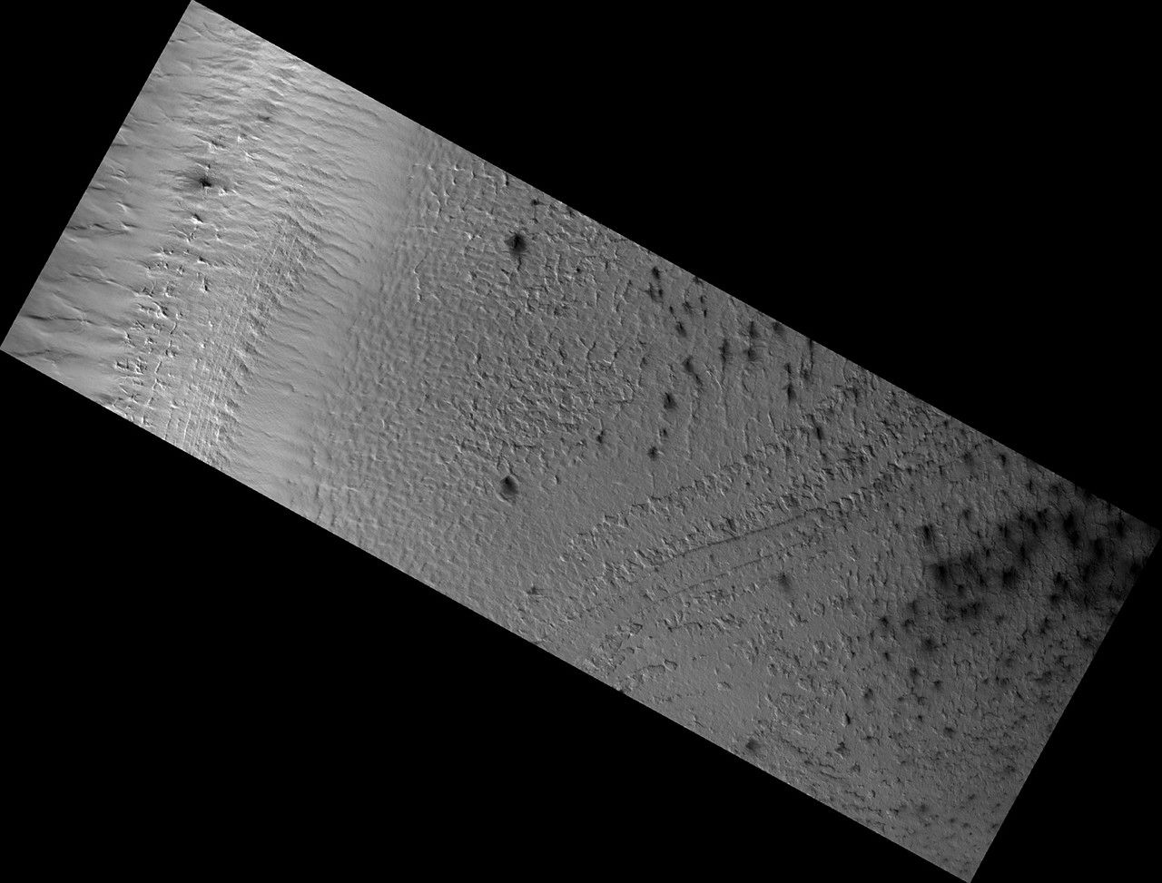 Subtle variations in color look like brush strokes as the lightly frosted terrain reflects light. These variations provide a backdrop to some exotic features referred to colloquially as "spiders."