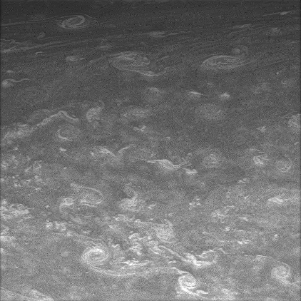 Twirling vortices swim through a vast ocean of hydrogen and helium in Saturn's far north.