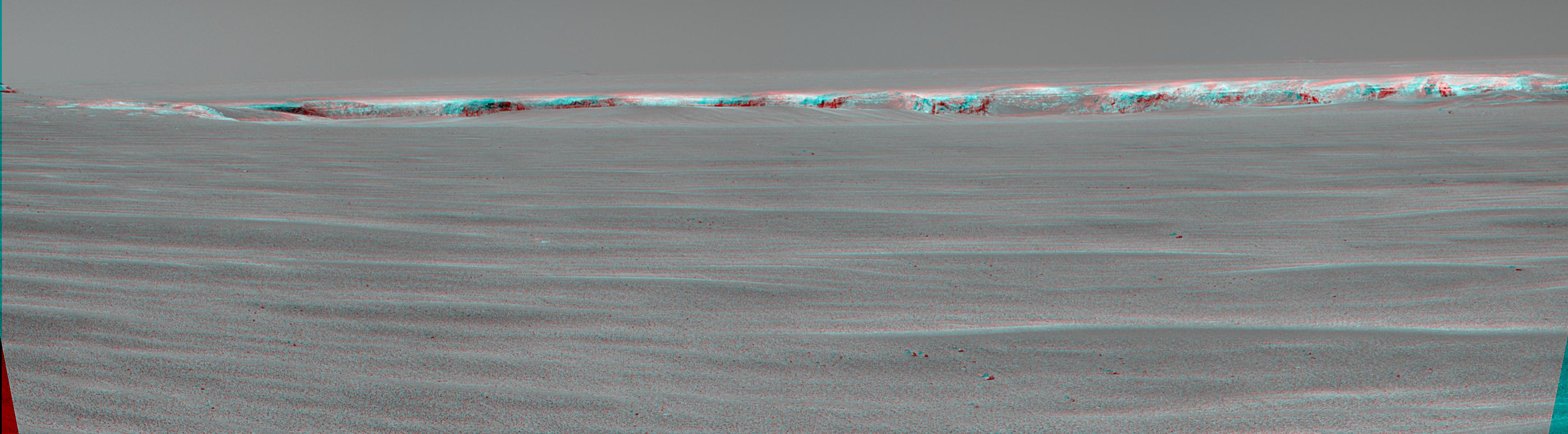 A drive of about 60 meters (about 200 feet) on the 943rd Martian day, or sol, of Opportunity's exploration of Mars' Meridiani Planum region (Sept. 18, 2006) brought the NASA rover to within about 50 meters (about 160 feet) of the rim of "Victoria Crater." This crater has been the mission's long-term destination for the past 21 Earth months. Opportunity reached a location from which the cameras on top of the rover's mast could begin to see into the interior of Victoria. This stereo anaglyph was made from frames taken on sol 943 by the panoramic camera (Pancam) to offer a three-dimensional view when seen through red-blue glasses. It shows the upper portion of interior crater walls facing toward Opportunity from up to about 850 meters (half a mile) away. The amount of vertical relief visible at the top of the interior walls from this angle is about 15 meters (about 50 feet). The exposures were taken through a Pancam filter selecting wavelengths centered on 750 nanometers.