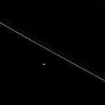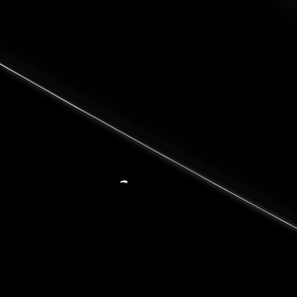 As Cassini hurtled toward its fatal encounter with Saturn, the spacecraft turned to catch this final look at Saturn's moon Pandora next to the thin line of the F ring.