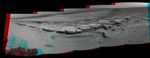 This 160-degree, stereo view from NASA's Curiosity Mars rover is centered southward toward a planned science waypoint at "the Kimberley," with an outcrop of eroded sandstone in the foreground. The panorama appears three dimensional when viewed through red-blue glasses with the red lens on the left. It combines several frames taken by the Navigation Camera (Navcam) high on the rover's mast, during the 574th Martian day, or sol, of Curiosity's work on Mars (March 18, 2014).