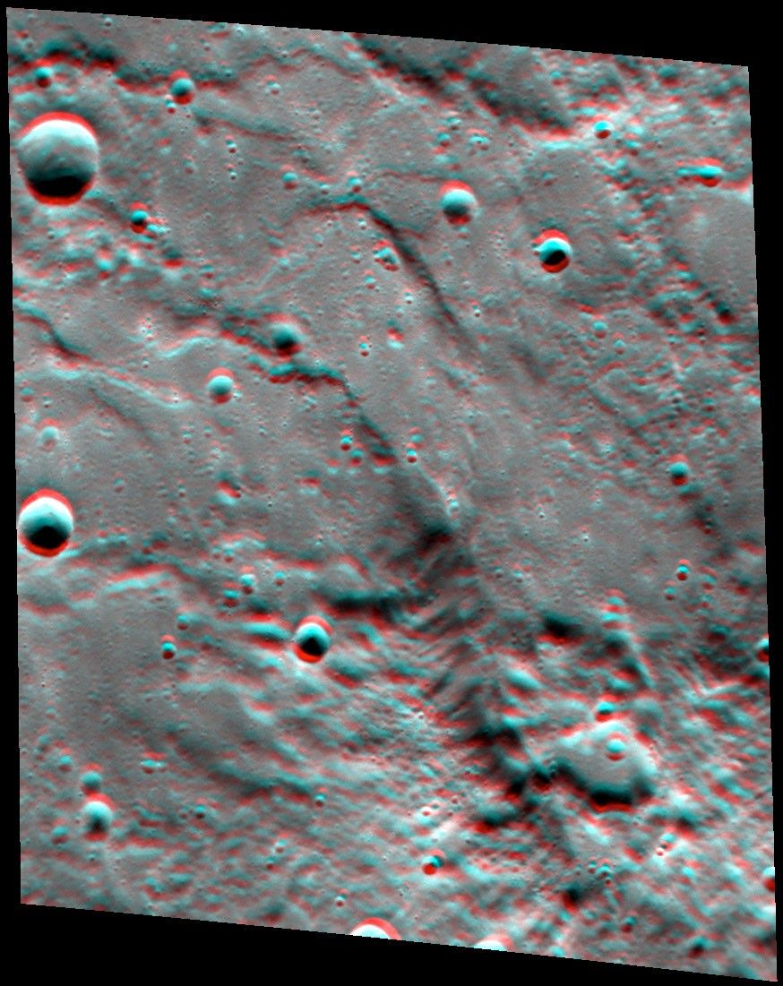 Red-cyan glasses will help you see the impressive heights of Paramour Rupes in this 3D view. Paramour is a large cliff (well over 600 meters high at places!) that formed when one block of crust was thrust forward over another, resulting in a feature known as a lobate scarp. Paramour Rupes is located to the southwest of the Caloris basin, and the small knobs that litter the scene are thought to be blocks of ejecta from the Caloris impact event. For ease of stereo viewing, this anaglyph has been rotated so that north is toward the left.