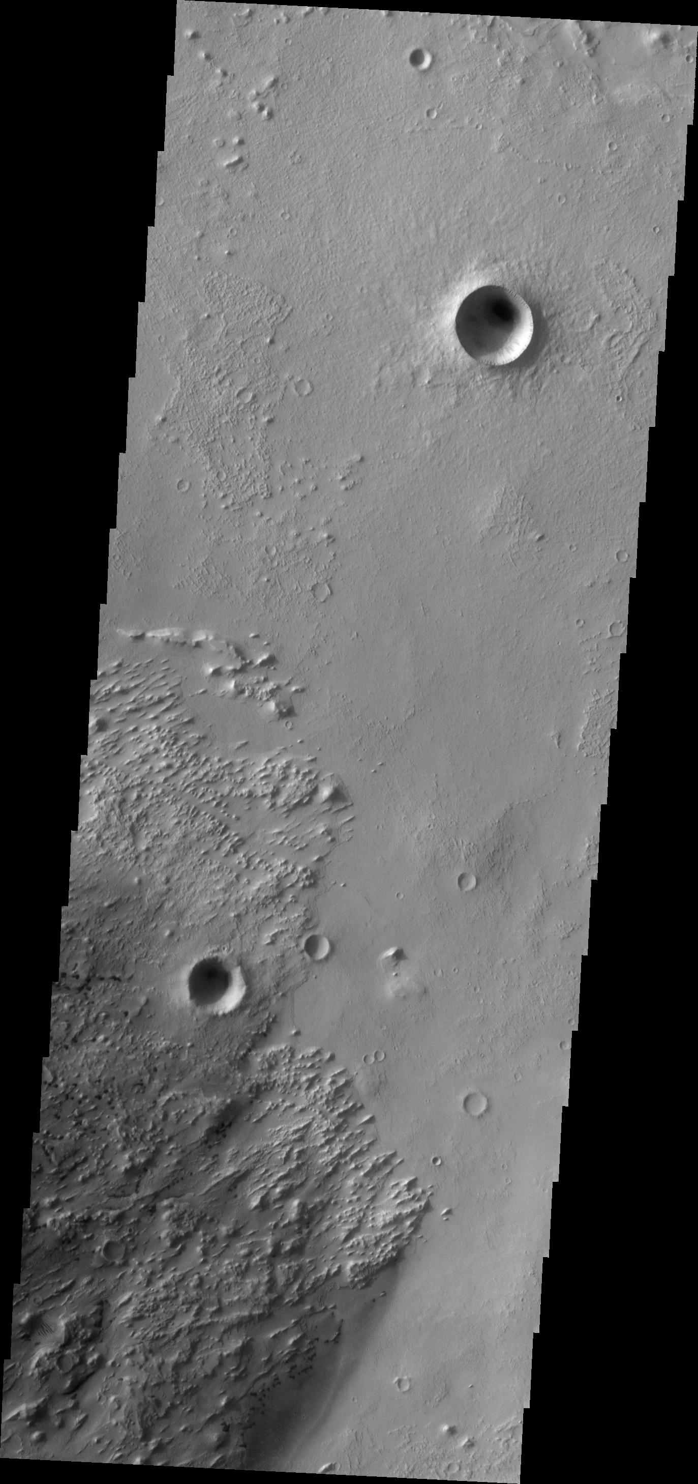 Note: this THEMIS visual image has not been radiometrically nor geometrically calibrated for this preliminary release. An empirical correction has been performed to remove instrumental effects. A linear shift has been applied in the cross-track and down-track direction to approximate spacecraft and planetary motion. Fully calibrated and geometrically projected images will be released through the Planetary Data System in accordance with Project policies at a later time.