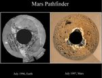This set of images shows the Mars Pathfinder lander in a cleanroom at JPL in 1996 on the left, and on Mars in 1997 (see PIA01238).