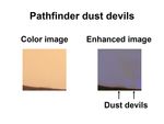 This set of images from NASA's 1997 Pathfinder mission highlight the dust devils that gust across the surface of Mars. The right image shows the dusty martian sky as our eye would see it. The left image has been enhanced to expose the dust devils that lurk in the hazy sky.