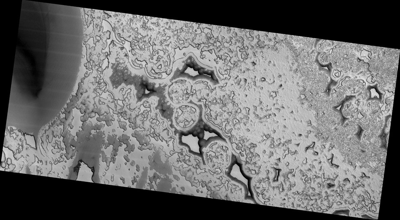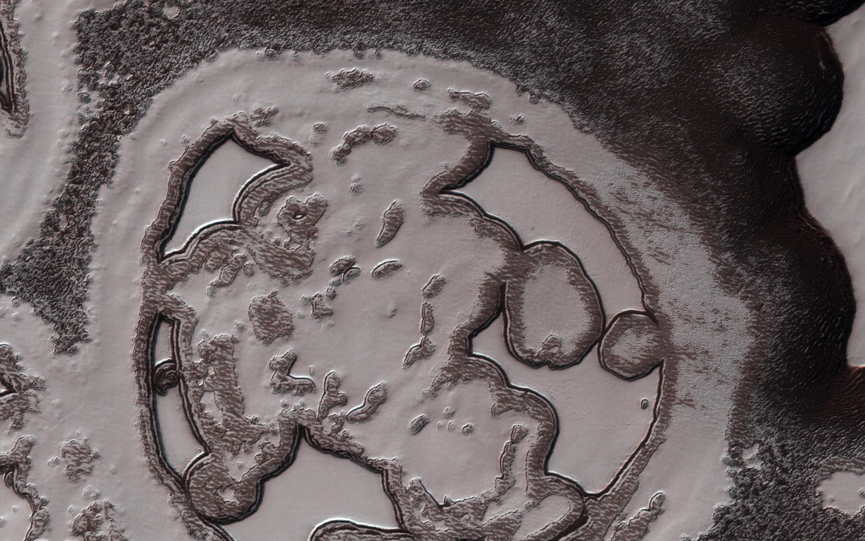 The texture is very alien, bearing more of a resemblance to the universe of the very small, rather than the universe far, far away. But if this is a polar cap, then why does it not look like the polar caps on Earth? Indeed, there is no equivalent terrain observed here on Earth.