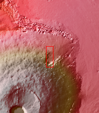 Today's VIS image shows Pavonis Chasma, a collapsed region on the northeastern flank of Pavonis Mons. The chasma is aligned with the trend of the three Tharsis volcanoes, of which Pavonis Mons is the central one.