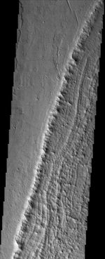 Note: this THEMIS visual image has not been radiometrically nor geometrically calibrated for this preliminary release. An empirical correction has been performed to remove instrumental effects. A linear shift has been applied in the cross-track and down-track direction to approximate spacecraft and planetary motion. Fully calibrated and geometrically projected images will be released through the Planetary Data System in accordance with Project policies at a later time.