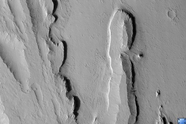 Despite the detail resolved by HiRISE, it is not clear why the step-forming layers are more resistant. Much of the scene is coated with a mantle of dust which obscures details. Dark slope streaks, likely produced by small avalanches in the dust, are common here. Dust deposition and erosion are also likely the reason for the scalloped texture of mantling material in the crater.