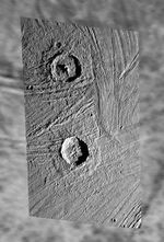 This image shows a Galileo high-resolution mosaic of craters Gula (top), about 40 km (25 miles) in diameter, and Achelous (bottom), about 35 km (21.8 miles) in diameter, projected on a lower-resolution background of image data that were obtained in the late 70s by the NASA Voyager spacecraft.