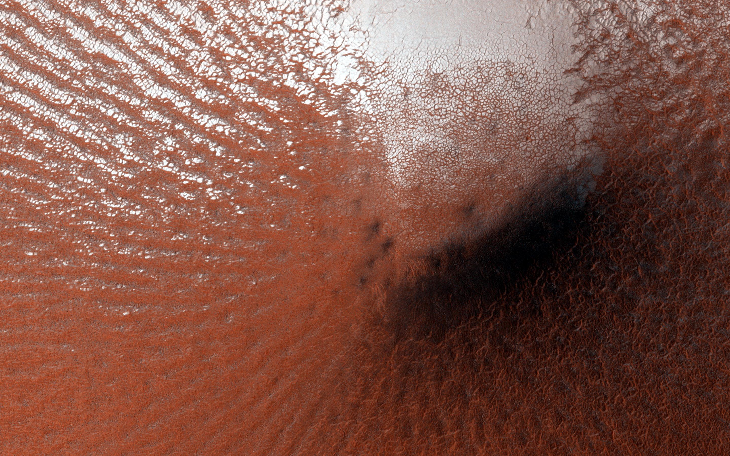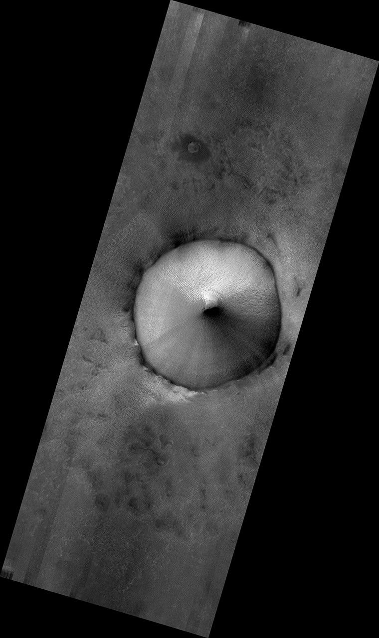 A still-unexplained feature of this crater is the diffuse dark smudges visible on the crater floor. These resemble "defrosting spots" which are visible on carbon dioxide ice in the early spring, but they occur on frost-free areas and survive throughout the summer.