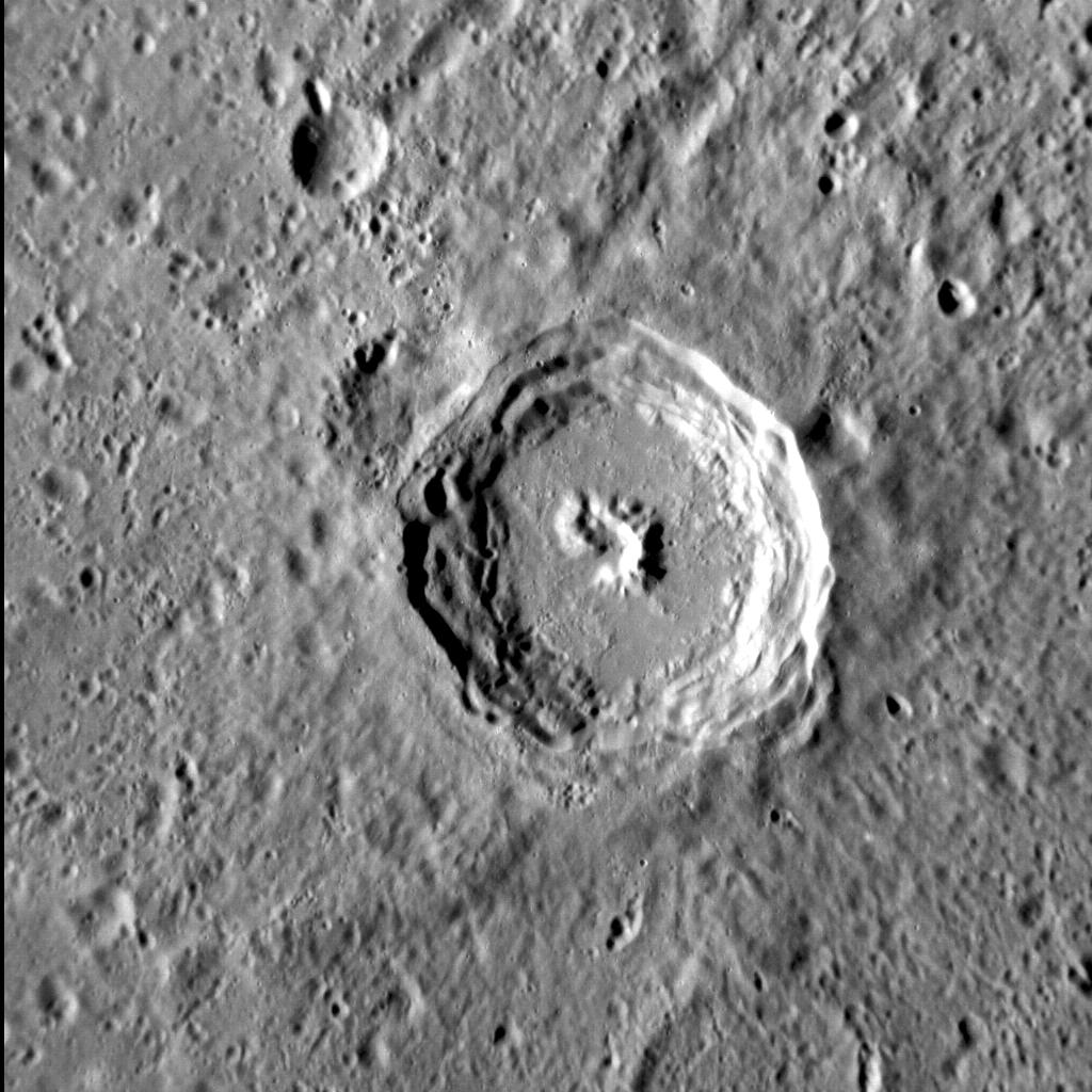 This image, with north to the top, shows a well-preserved, unnamed complex crater in Mercury's northern hemisphere. The central peak and terraced walls characteristic of complex craters are clearly visible. The smooth floor of the crater is probably composed of solidified impact melt. The continuous ejecta blanket emanating from the crater has softened the texture of the surrounding terrain.