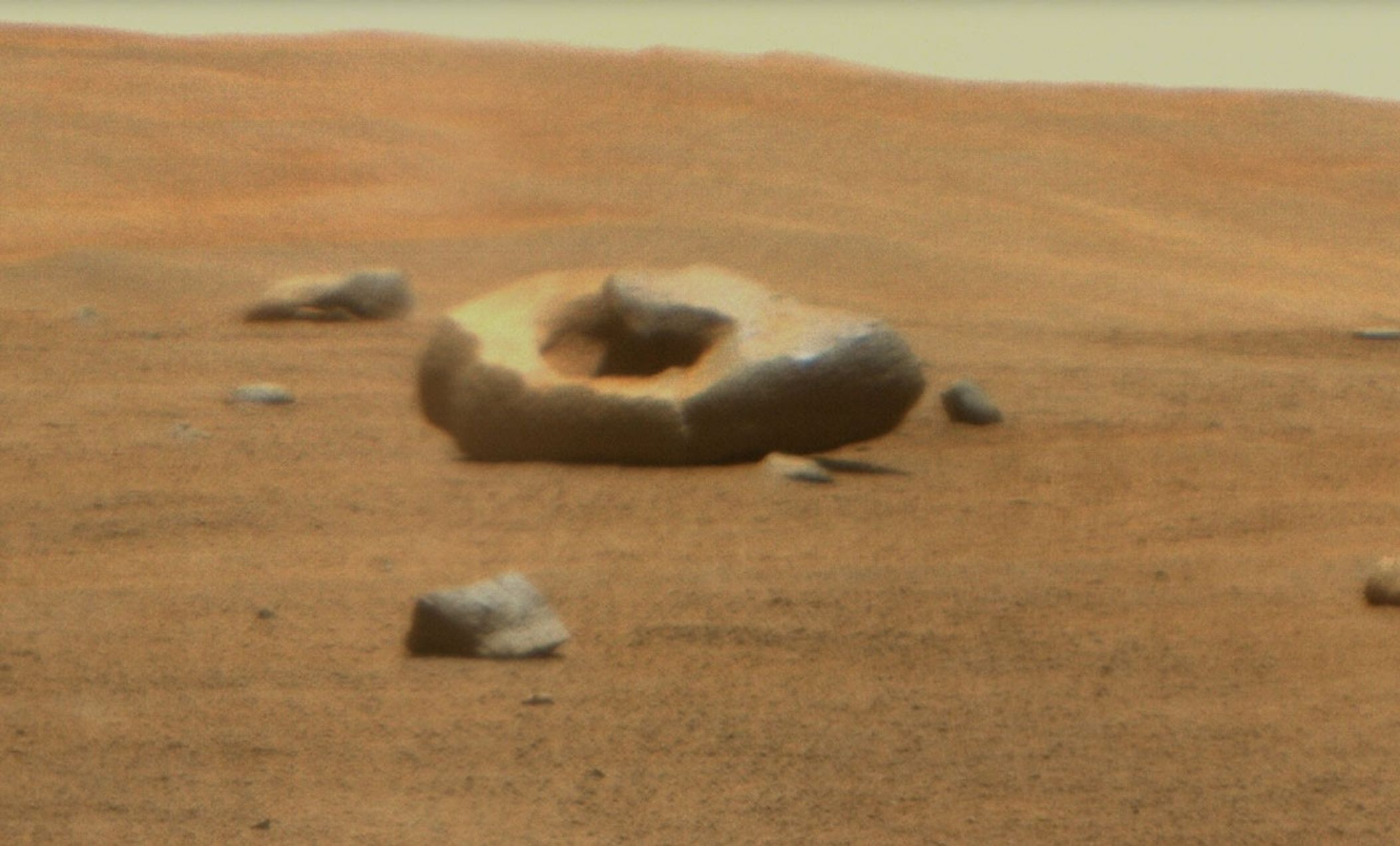 NASA's Perseverance Mars rover captured this doughnut-shaped rock in Jezero Crater from about 328 feet (100 meters) away using its Remote Microscopic Imager (RMI), part of the SuperCam instrument, on June 22, 2023, the 832nd Martian day, or sol, of the mission. Oddly shaped rocks aren't uncommon, either on Earth or Mars; they're often formed over eons as winds sandblast rock faces. This particular rock may have formed after a smaller rock (or multiple rocks) eroded near its center. That left behind a cavity that was later enlarged by the wind.