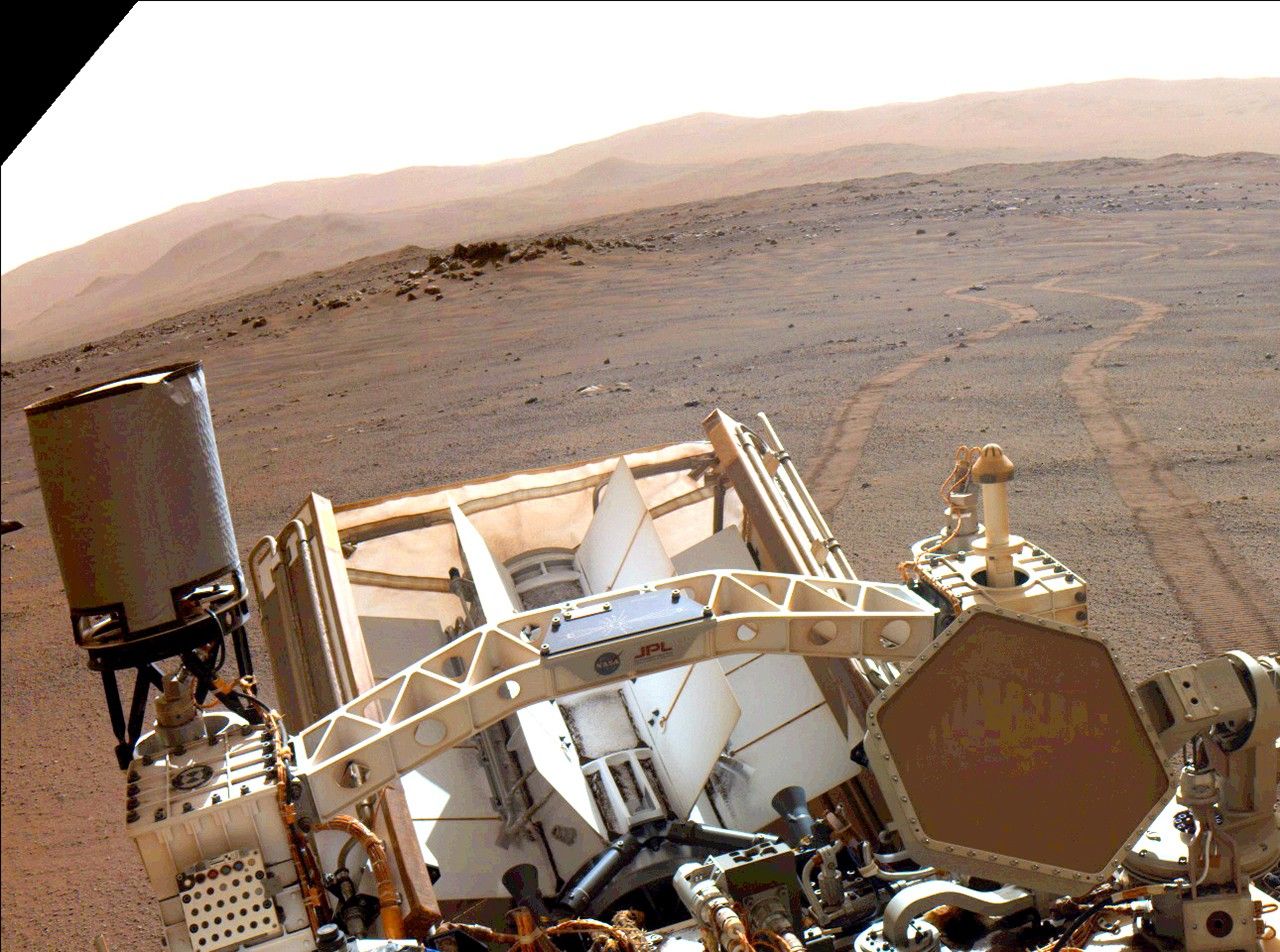 NASA's Perseverance Mars rover looks back at its wheel tracks on March 17, 2022, the 381st Martian day, or sol, of the mission.
