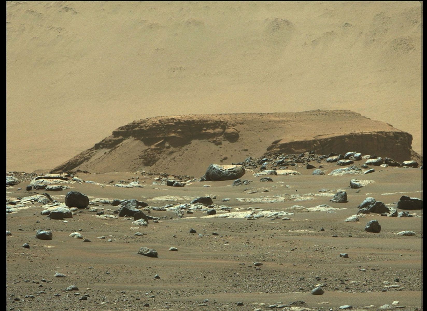 From its landing site, "Octavia E. Butler Landing," NASA's Perseverance rover can see a remnant of a fan-shaped deposit of sediments known as a delta with its Mastcam-Z instrument. Scientists believe this delta is what remains of the confluence between an ancient river and a lake at Mars' Jezero Crater. The delta remnant is the raised area of dark brown rock in the middle ground this image acquired on Feb. 22, 2021.