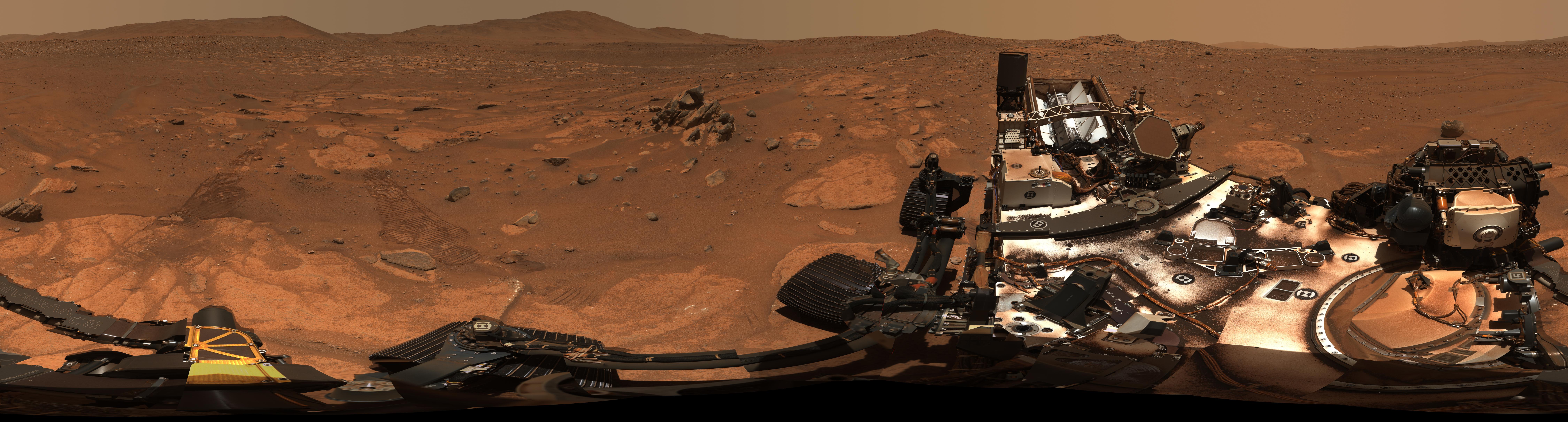 Composed of 993 individual images and 2.38 billion pixels, this 360-degree mosaic taken by NASA's Perseverance looks in all directions from a location the rover science team calls "Airey Hill." The rover remained parked at Airey Hill during the entirety of solar conjunction.