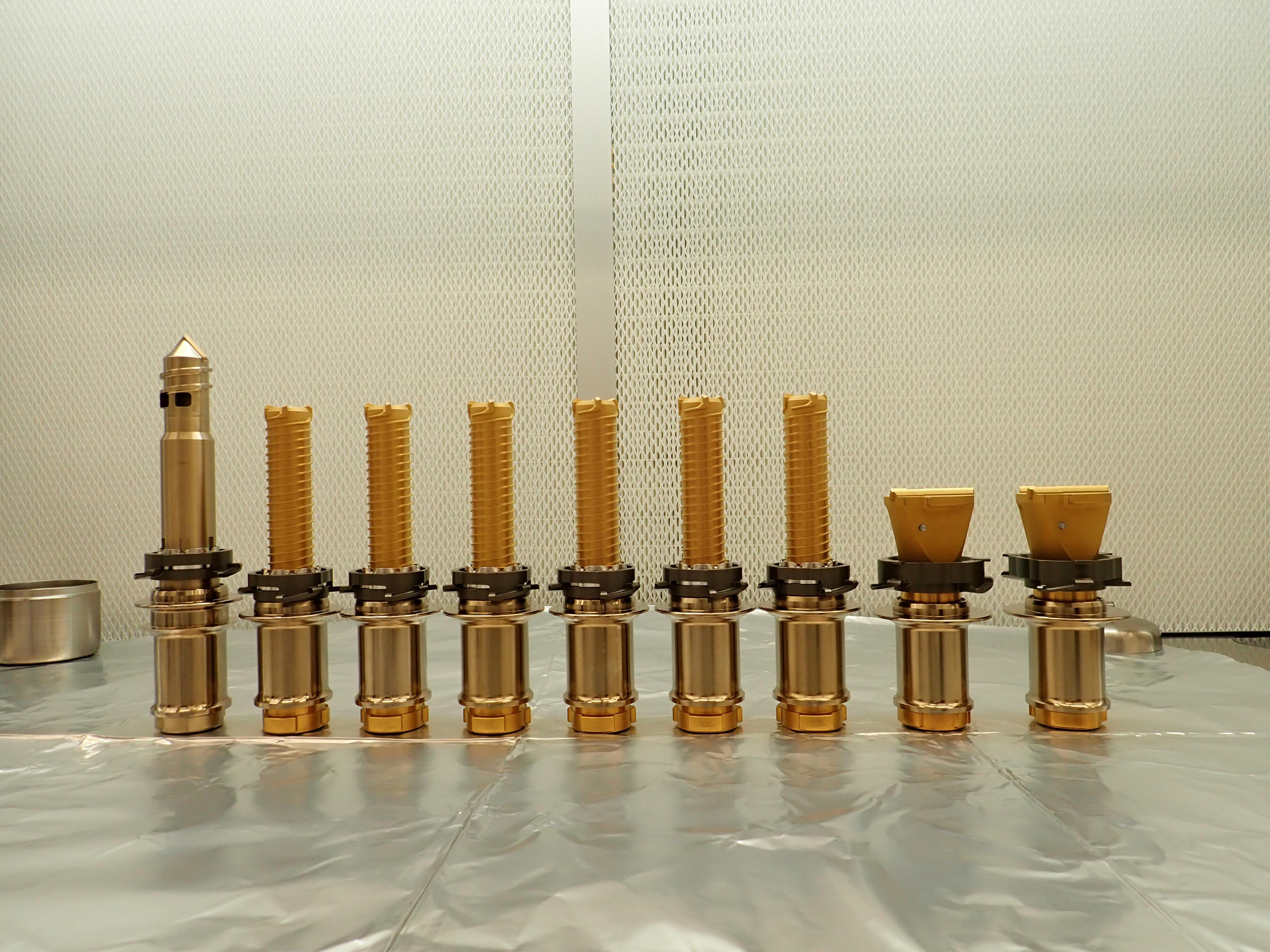 The drill bits used by NASA's Perseverance rover are seen before being installed prior to launch. From left, the regolith bit, six bits used for drilling rock cores, and two abrasion bits.
