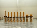 The drill bits used by NASA's Perseverance Mars rover are seen before being installed prior to launch. The regolith bit is on the left, followed by six bits used for drilling rock cores. On the right are two abrasion bits that are used to remove the dust-covered outer layer of a rock so that the rover can take accurate data of its composition.