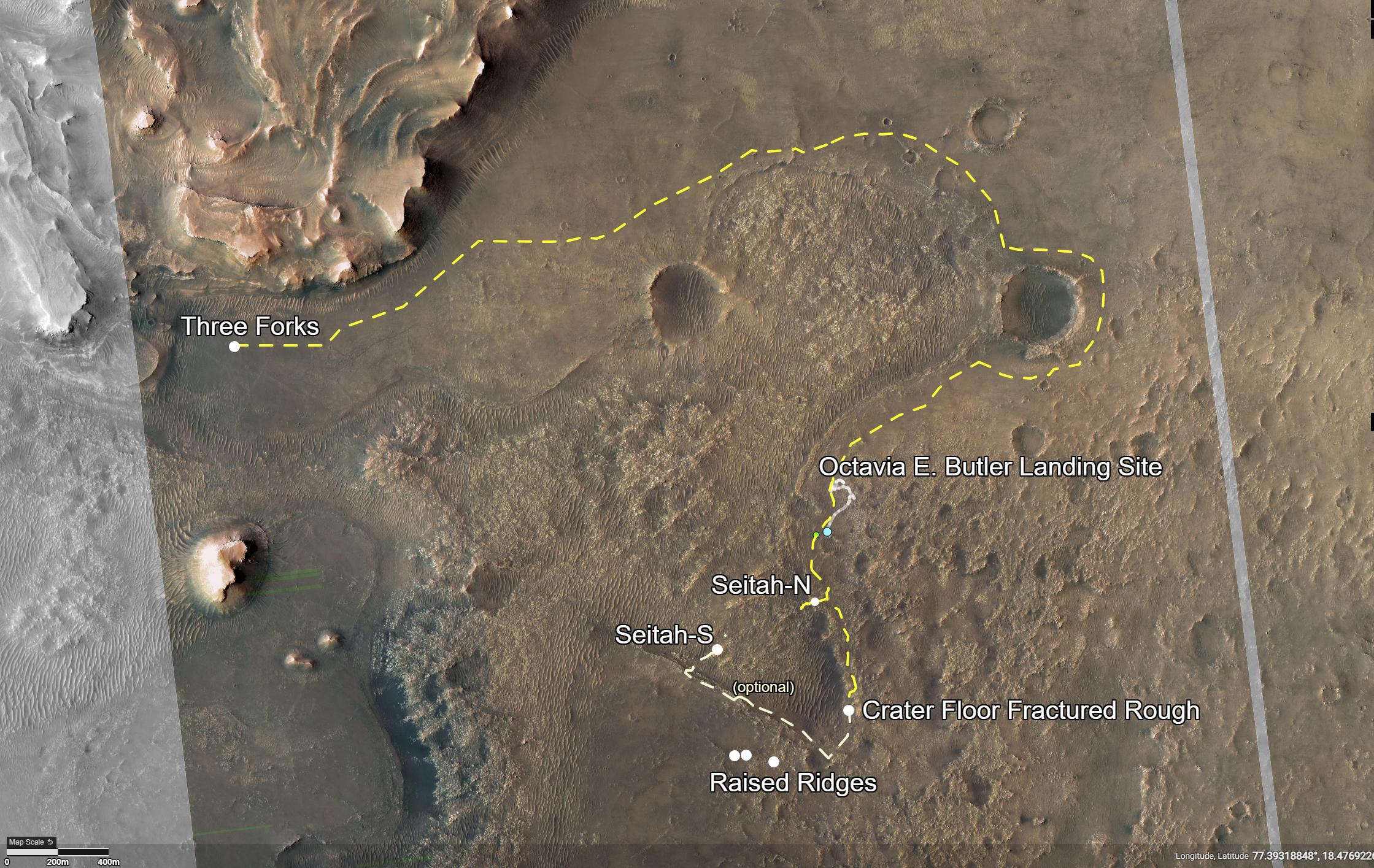 Perseverance's first science campaign sends the rover south and west of the Octavia E. Butler Landing Site to investigate and sample several of the deepest, and potentially oldest, accessible geologic units in Jezero Crater – the "Séítah" unit (which in Navajo language means "amidst the sand"), and the "Cratered Floor Fractured Rough." At the completion of the science campaign, Perseverance will return to the "Octavia E. Butler" landing site on its way north, then head west toward the location where its second science campaign will begin.