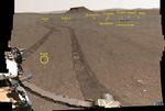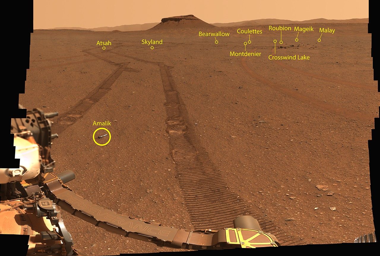 The "Amalik" sample closest to the rover was approximately 10 feet (3 meters) away from the camera at the time the image was taken. The "Atsah" and "Skyland" samples were approximately 66 feet (20 meters) away. "Bearwallow," "Coulettes," "Montdenier," "Crosswind Lake," and "Roubion" were approximately 115 to 164 feet (35 to 50 meters) away. "Mageik" and "Malay" were approximately 197 feet (60 meters) away.