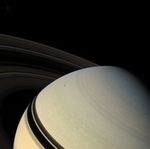 The ringed planet sits in repose, the center of its own macrocosm of many rings and moons and one artificial satellite named Cassini. Mimas (397 kilometers, or 247 miles across) is visible at upper left. Although unseen in this view, Enceladus (504 kilometers, or 313 miles across) casts its shadow upon the planet. The rings also block the sun's light from the low latitudes of the northern hemisphere.