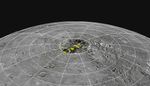 Perspective view of Mercury's north polar region with the radar-bright regions shown in yellow. New results presented today at the NASA News Conference provide compelling evidence that the radar-bright deposits are water ice. View a higher resolution perspective view of Mercury's north polar region here and a high resolution map view of the north polar region here.