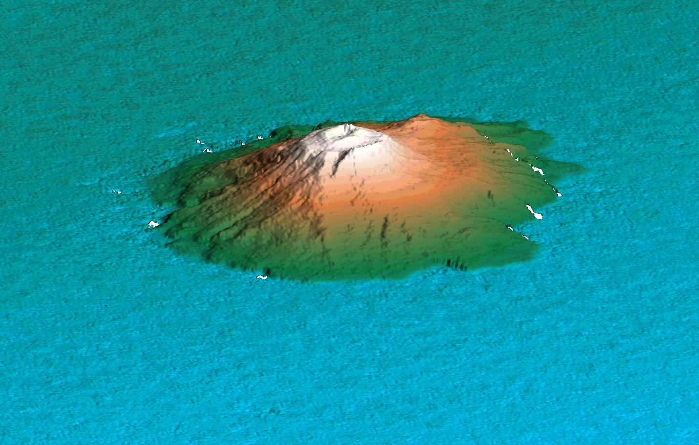 Size: Scale varies in this perspective image, island has an area of 55 square kilometers (21 square miles). Vertical scale approximately equal to horizontal scale.