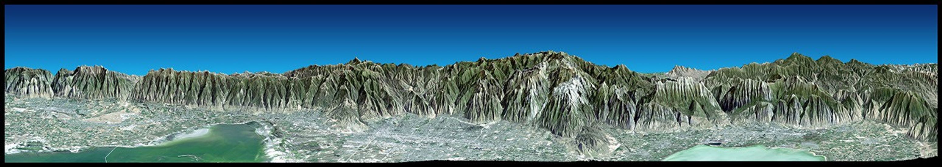 Most of the population of Utah lives just west of the Wasatch Mountains in the north central part of the state. This broad east-northeastward view shows that region with the cities of Ogden, Salt Lake City, and Provo seen from left to right. The Great Salt Lake (left) and Utah Lake (right) are quite shallow and appear greenish in this enhanced natural color view. Thousands of years ago ancient Lake Bonneville covered all of the lowlands seen here. Its former shoreline is clearly seen as a wave-cut bench and/or light colored "bathtub ring" at several places along the base of the mountain front - evidence seen from space of our ever-changing planet.