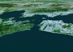 This three-dimensional perspective view was generated using topographic data from the Shuttle Radar Topography Mission (SRTM) and an enhanced false-color Landsat 5 satellite image. Colors are from Landsat bands 3, 2, and 1 as red, green and blue, respectively. Topographic expression is exaggerated two times.