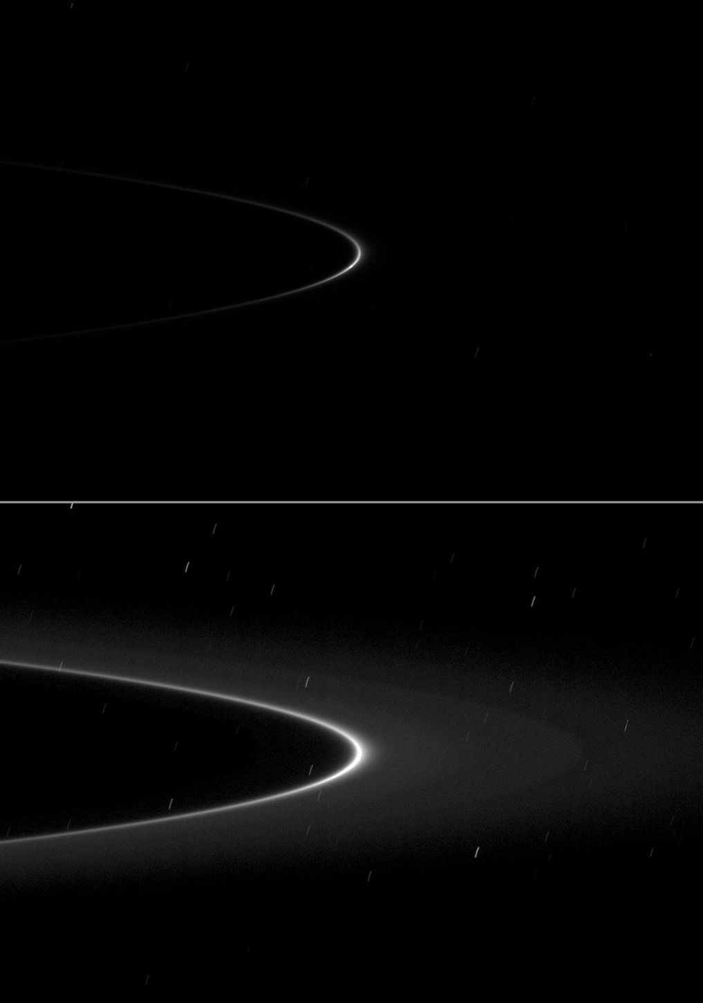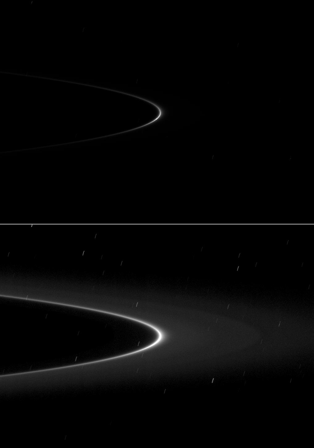 A small moonlet is just visible as a short streak near the ansa of the G ring arc in the top of two versions of the same image. The second (bottom) version of the image has been brightened to enhance the visibility of the G ring. The other streaks in this version of the image are stars smeared by the camera's long exposure time of 26 seconds. This version of the image shows a gap in the G ring which was faintly visible in an earlier Cassini movie (see PIA08327).