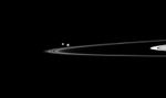 Two of Saturn's small moons can be seen orbiting beyond the planet's thin F ring in this Cassini spacecraft image.