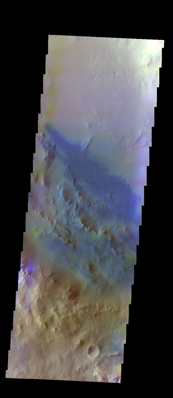 The THEMIS VIS camera contains 5 filters. The data from different filters can be combined in multiple ways to create a false color image. These false color images may reveal subtle variations of the surface not easily identified in a single band image. Today's false color image shows some of the dunes located on the floor of Pettit Crater.