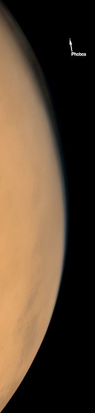 Phobos is one of the darkest objects in the Solar System. Thus, four wide angle images were obtained to make the picture of Phobos over the martian limb: a pair of red and blue wide angle images was acquired for the limb, and a pair of separate images were required to see Phobos. The wide angle images illustrate the fact that Phobos is mostly colorless (dark gray); the faint orange/red hue in the wide angle picture is a combination of slight differences in the focal lengths of the blue and red cameras and the orange/red illumination provided by reflection of sunlight off Mars. To a person standing on Phobos, the red planet would fill most of the sky.