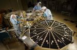 NASA's next Mars-bound spacecraft, the Phoenix Mars Lander, was partway through assembly and testing at Lockheed Martin Space Systems, Denver, in September 2006, progressing toward an August 2007 launch from Florida. In this photograph, spacecraft specialists work on the lander after its fan-like circular solar arrays have been spread open for testing. The arrays will be in this configuration when the spacecraft is active on the surface of Mars.