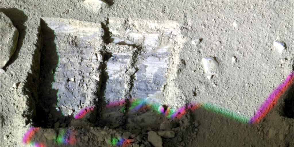 This false color image, taken by NASA's Phoenix Mars Lander's Surface Stereo Imager, was taken on the 131st Martian day, or sol, of the mission (Oct. 7, 2008). The image shows color variations of the trench, informally named "La Mancha," and reveals the ice layer beneath the soil surface. The trench's depth is about 5 centimeters deep.