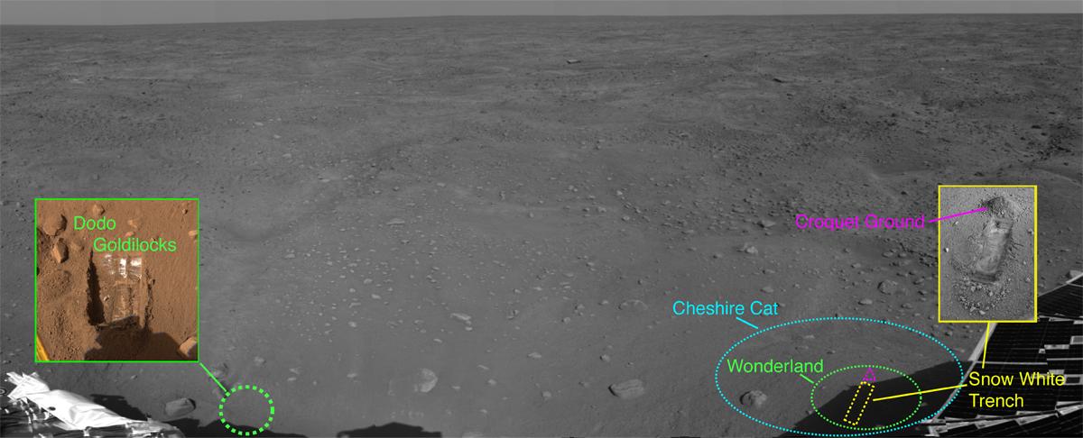 The first two trenches dug by the lander's Robotic Arm, called "Dodo" and "Goldilocks," were enlarged on the 19th Martian day of the mission, or Sol 18 (June 12, 2008), to form one trench, dubbed "Dodo-Goldilocks." Scoops of material taken from those trenches are informally called "Baby Bear" and "Mama Bear." Baby Bear was carried to Phoenix's Thermal and Evolved-Gas Analyzer, or TEGA, instrument for analysis, while Mama Bear was delivered to Phoenix's Microscopy, Electrochemistry and Conductivity Analyzer instrument suite, or MECA, for a closer look.