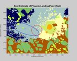 The center of the red circle on this map shows where NASA's Phoenix Mars Lander eased down to the surface of Mars, at approximately 68 degrees north latitude, 234 degrees east longitude. Before Phoenix landed, engineers had predicted it would land within the blue ellipse.