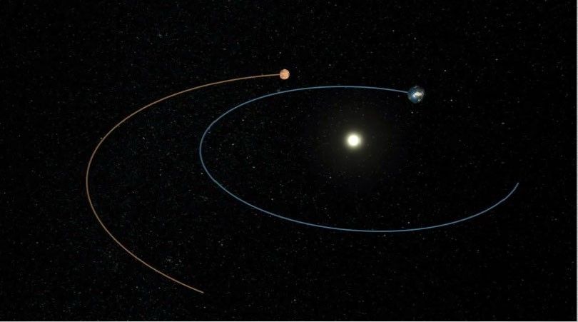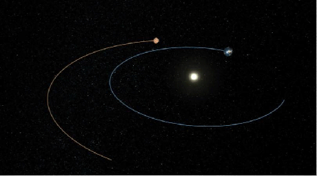 This artist's animation shows the route NASA's Phoenix Mars Lander took to get from Earth to Mars. The spacecraft's path is shown in yellow, and the orbits of Mars and Earth are shown in red and blue, respectively.
