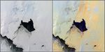 The Multi-angle Imaging SpectroRadiometer (MISR) instrument on NASA's Terra spacecraft passed over the Pine Island Glacier in Antarctica around 15:15 UTC on Oct. 27, 2013, just days before B-31 broke completely free. The left-hand image in this pair shows a true-color view of the glacier from MISR's nadir (0 degree) camera. The image is oriented so that north is to the left and east is toward the top. A large crack is visible in the ice near the center of the image, which is where the iceberg eventually detached. The image on the right is a multi-angle composite made up of red-band images from the 60-degree forward, nadir and 60-degree aftward-looking cameras in the red, green and blue channels, respectively. When visualized in this manner, surfaces that generally scatter light in the backward direction, which tend to be rough surfaces, appear orange, while smooth surfaces, which tend to scatter light in the forward direction, appear blue. A few clouds in the scene, just over the open water below the glacier, appear purple as their location is shifted slightly from one view to the next due to stereo parallax. This parallax is used in MISR processing to retrieve cloud heights over snow and ice. Additionally, a plume of blowing snow can be seen as slightly bluish in the bottom center of the image.