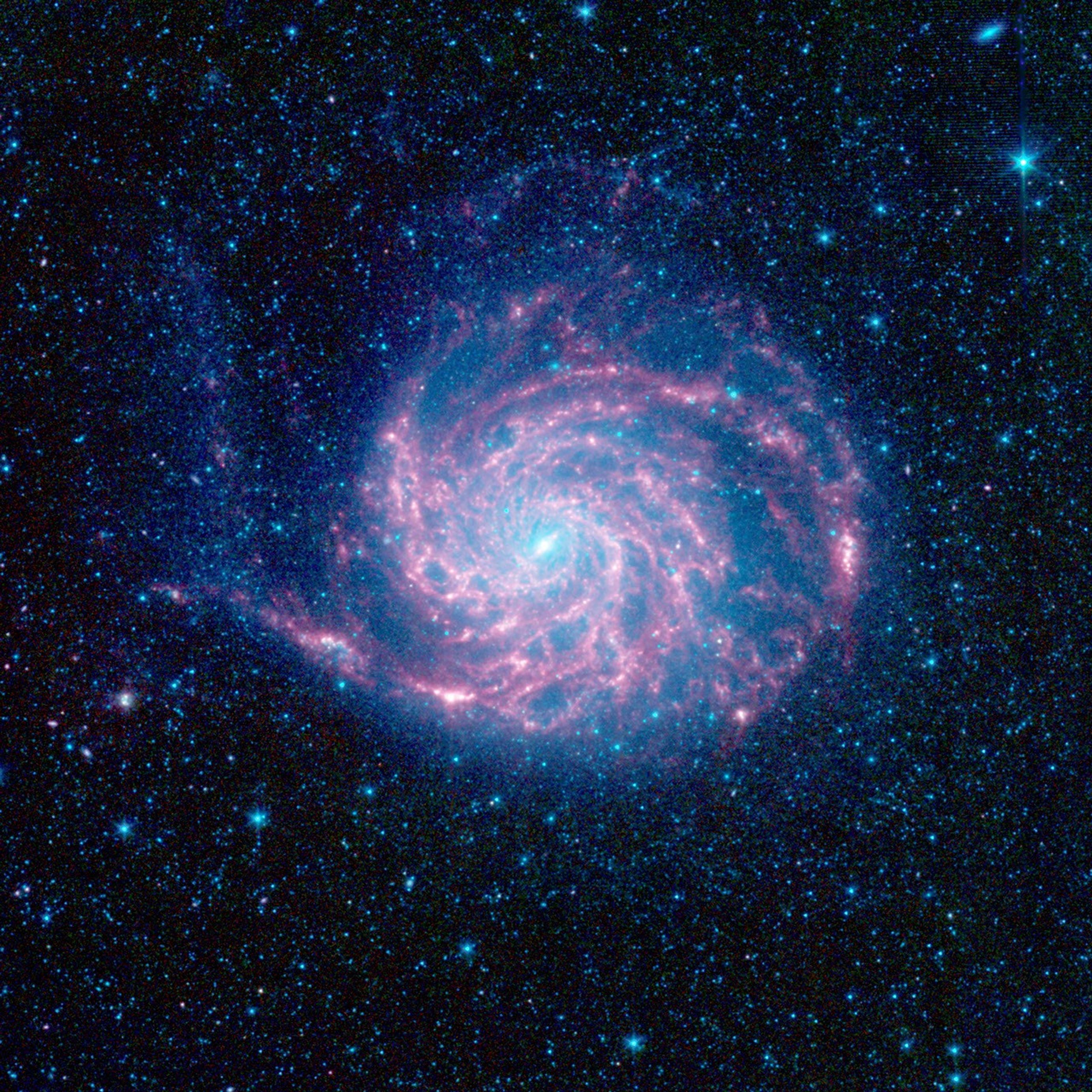 In this infrared composite, blue indicates light with a wavelength of 3.6 microns, green corresponds to 4.5 microns, and red to 5.8 and 8.0 microns. The contribution from starlight (measured at 3.6 microns) has been subtracted from the 5.8- and 8-micron images to enhance the visibility of the dust features.