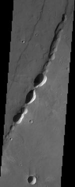 These pit-chain features in south Noctis Labryinthus are oriented parallel to grabens in the area, suggesting that tensional stresses may have been responsible for their formation.