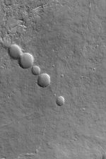 This Mars Global Surveyor (MGS) Mars Orbiter Camera (MOC) image shows a chain of collapse pits on the lower northeast flank of the large martian volcano, Olympus Mons. For these to have formed, something in the subsurface must have been removed or changed volume, such as cooling lava within a subsurface lava tube or extension of the crust by faulting. These pits are located near 20.6°N, 129.4°W. The picture covers an area about 3 km (1.9 mi) across. Sunlight illuminates the scene from the lower left.
